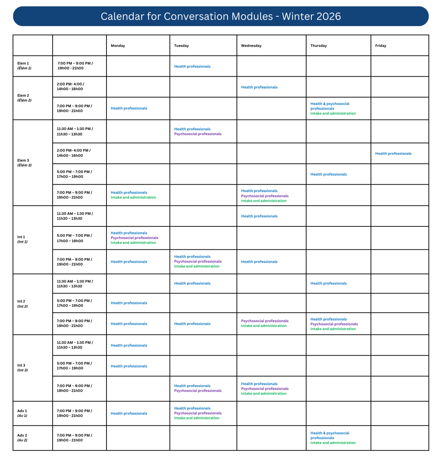 These are the current and upcoming calendars for important dates related to the Anglais Santé modules. Calendars follow fiscal years.
